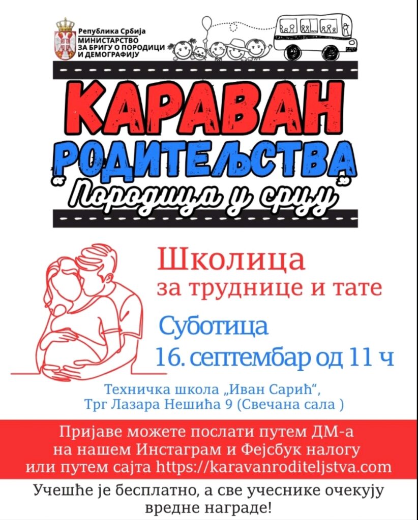 Кампању Караван родитељства – Породица у срцу реализује Министарство за бригу о породици и демографију у сарадњи са локалним самоуправама широм Србије и уз подршку пројекта Људи чине град, који спроводи УНДП уз подршку Министарства, а манифестација ће у Суботици бити одржана у Техничкој школи „Иван Сарић”, и то у 10 часова – Пузијада за наше најмање тркаче, а у 11 часова – трибина за труднице и тате.